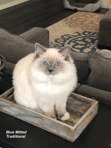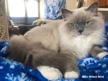 Minks and traditional are both pure ragdolls, both are registrable with TICA. In the picture on this page, all three kittens are seal, 2 are seal traditional and 1 is a seal mink. The fur of a mink kitten is softer and smoother than that of a traditional. Traditional ragdolls are born solid white and their pointed color starts to appear on their ears when they are 2-3 days old. Mink ragdolls are born a warmer color and also start to receive their pointed color when they are 2-3 days old. Both traditional and mink kittens are born with blue eyes. The eyes on the mink kitten will change to a beautiful aqua color as they age, while the eyes of a traditional ragdoll will remain a stunning blue. When we breed our traditional queens to our mink king, we get both traditional and mink kittens. Sometimes we get one in a litter and sometimes we get more than half mink. We never know until they are born. Our minks come in seal or blue. Minks also come in all the standard patterns: color point (no white), mitted (white mitts on front paws, boots on back legs, white chin and bib), bi-color (inverted "V" on face white on all legs, chin and bib) and lynx (tabby like marking). Most minks have a all over color appearance to them. As far as temperament there is no difference they are all ragdoll.